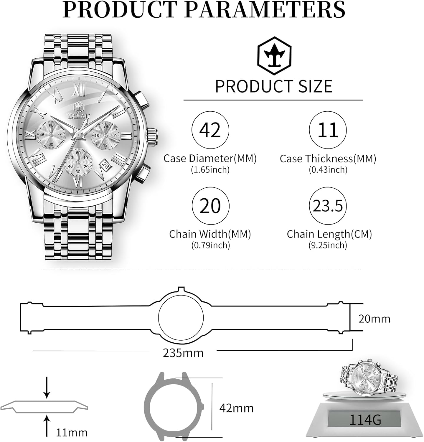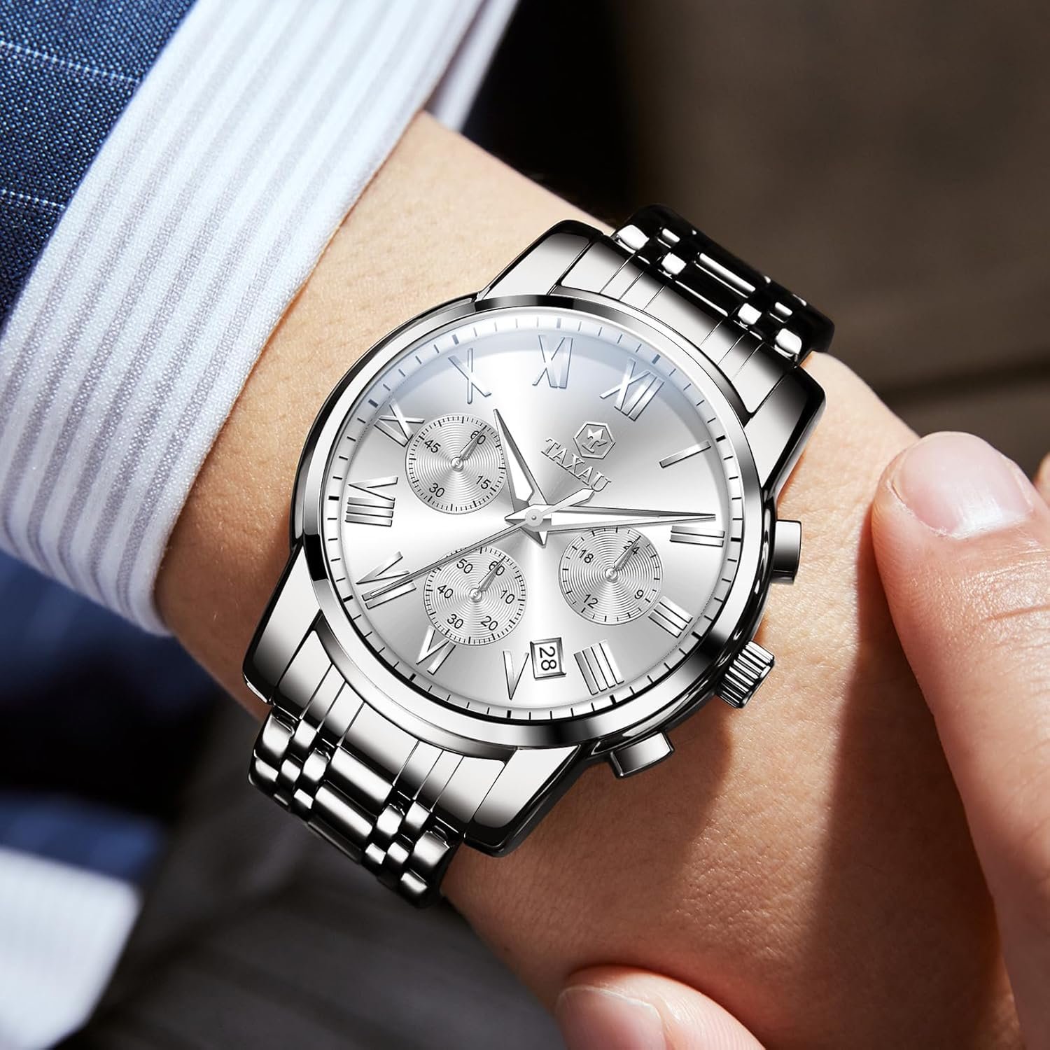 The Men’s Stainless Steel Luxury Diamond Chronograph Watch is a sophisticated and stylish timepiece designed for men who appreciate elegance, precision, and luxury. Featuring a stainless steel case, diamond accents, chronograph functionality, and date display, this watch combines style and practicality, making it suitable for business, formal, and casual occasions. In this review, we’ll cover its design, features, pros and cons, and user experience.